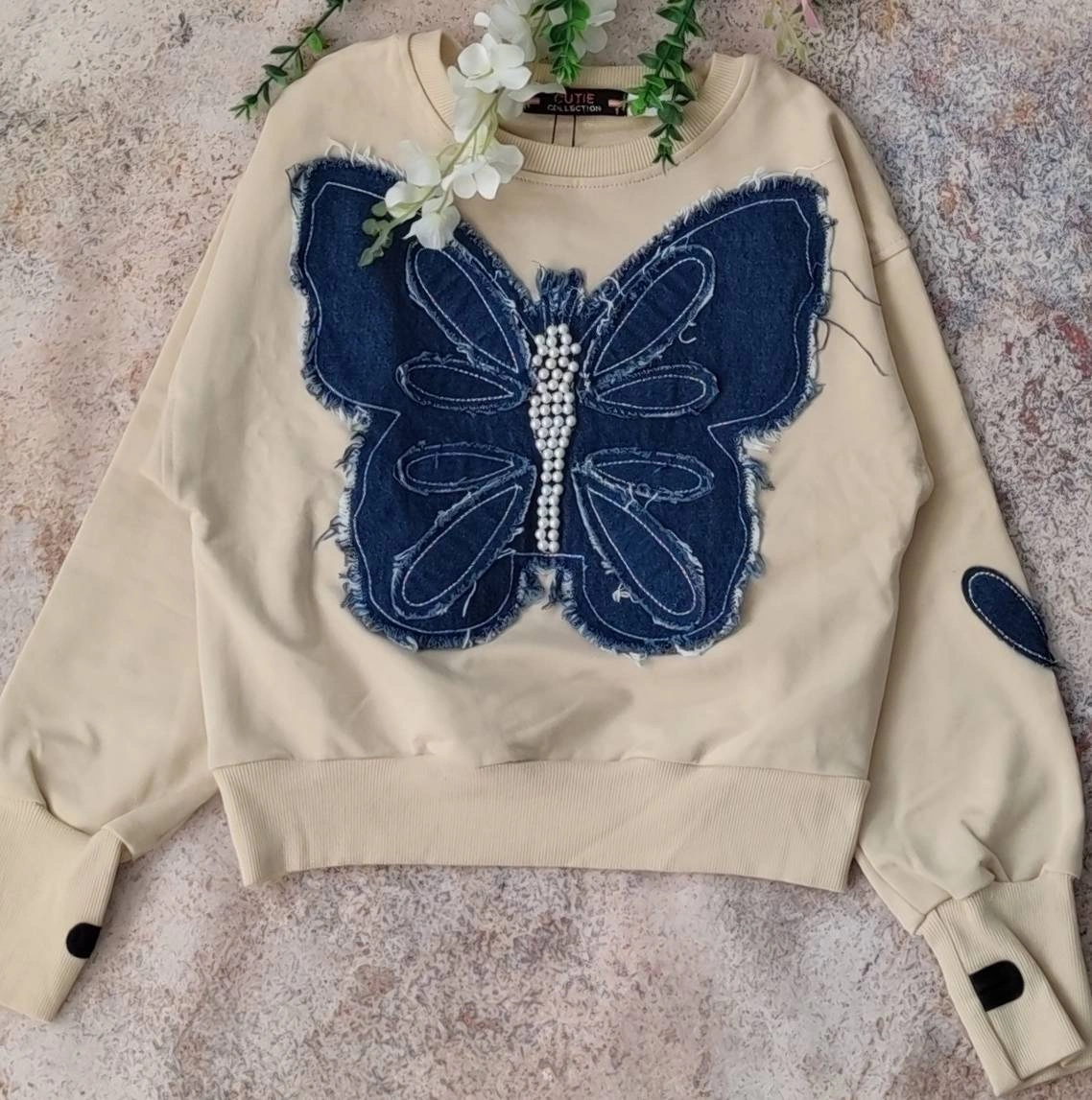طرح روی لباس کار شده با جین و مروارید